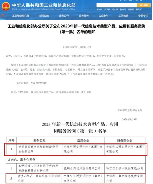 喜报!中国煤科西安研究院两项产品入选工信部新一代信息技术典型产品、应用和服务案例
