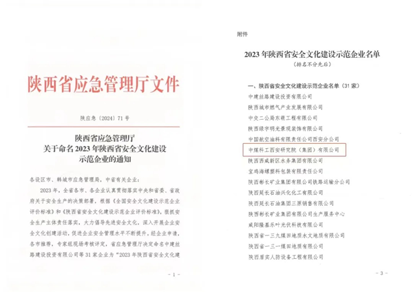陕西省应急管理厅正式发布了2023年陕西省安全文化建设示范企业名单,中国煤科西安研究院成功入选该名单,荣获陕西省安全文化建设示范企业称号。