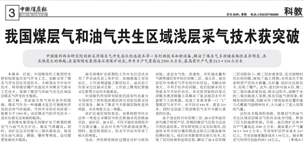 我国煤层气和油气共生区域浅层采气技术获突破
