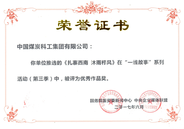 为深入贯彻落实习近平总书记“关于加强和改进国有企业新闻宣传工作重要讲话精神”,积极培育和践行社会主义核心价值观,国务院国资委新闻中心于2016年9月开展了 “一线故事”系列活动的第三季——“中国建设者”,以讲故事的方式展现一线员工无私奉献、追求卓越的精神风貌。至征文活动截止时日,全院共收到征文11篇,经择优筛选,西安研究院报送集团公司7篇。随后,集团公司在全系统征集的基础上,上报国资委新闻中心18篇(含我院7篇),均刊登在中国新闻网“一线故事”栏目。其中西安研究院钻探所的作品“扎寨西南 沐雨栉风”代表中国煤科唯一荣获优秀作品奖。