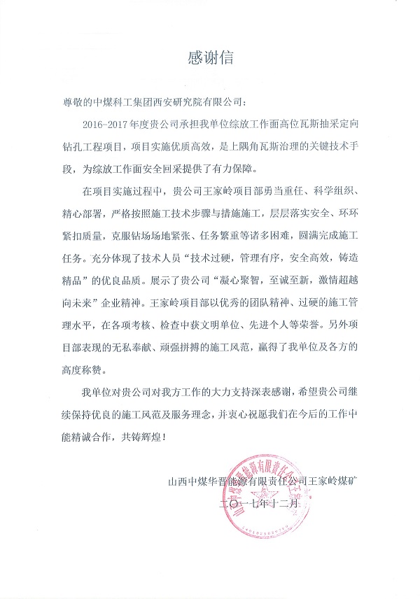 2017年12月中煤华晋能源有限责任公司王家岭煤矿向西安研究院发来感谢信,赞扬西安研究院员工在矿井综放工作面高位瓦斯抽采定向钻孔工程项目中精湛的施工技术和顽强的拼搏精神;感谢他们为综放工作面安全回采提供有力保障。同时,该矿还授予西安研究院钻井所王家岭项目部文明单位称号,以表彰项目部优秀的团队精神和过硬的管理水平。