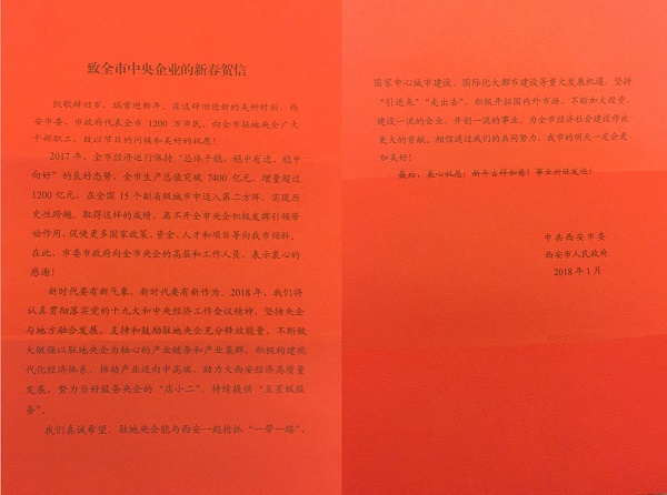 贺信中写道:2017年,全市经济运行保持“总体平稳、稳中有进、稳中向好”的良好态势,全市生产总值突破7400亿元,增量超过1200亿元,在全国15个副省级城市中迈入第二方阵,实现历史性跨越。取得这样的成绩,离不开全市央企积极发挥引领带动作用、促使更多国家政策、资金、人才和项目等向我市倾斜。在此,市委市政府向全市央企的高层和工作人员,表示衷心的感谢!