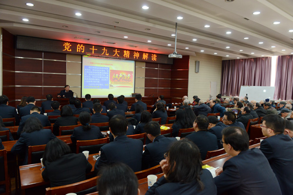 党委书记董书宁围绕“党的十九大”核心内容,从八个方面概括总结了十九大提出的新思想、新论断、新要求,并系统全面地做了分析和解读。同时,全面介绍了新修订的党章,并重点对新修订的内容和条款做了说明。