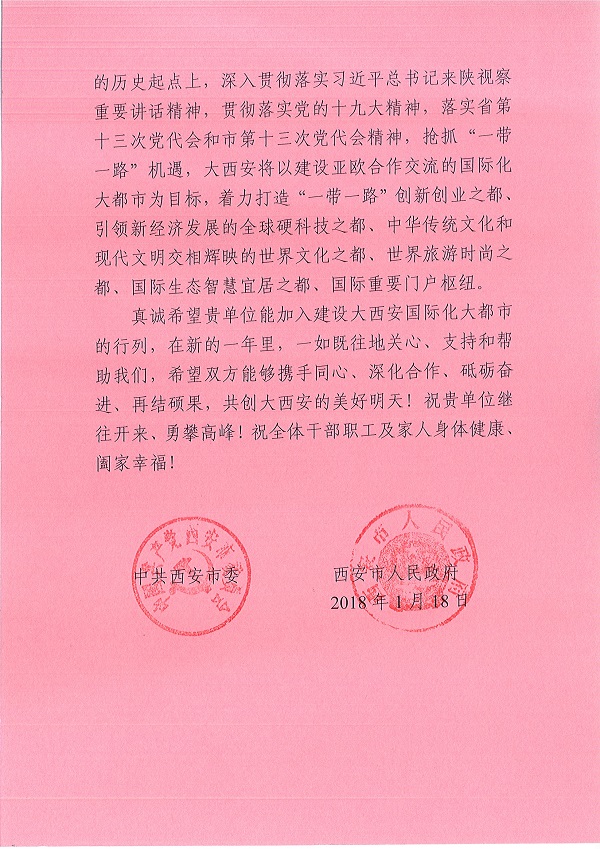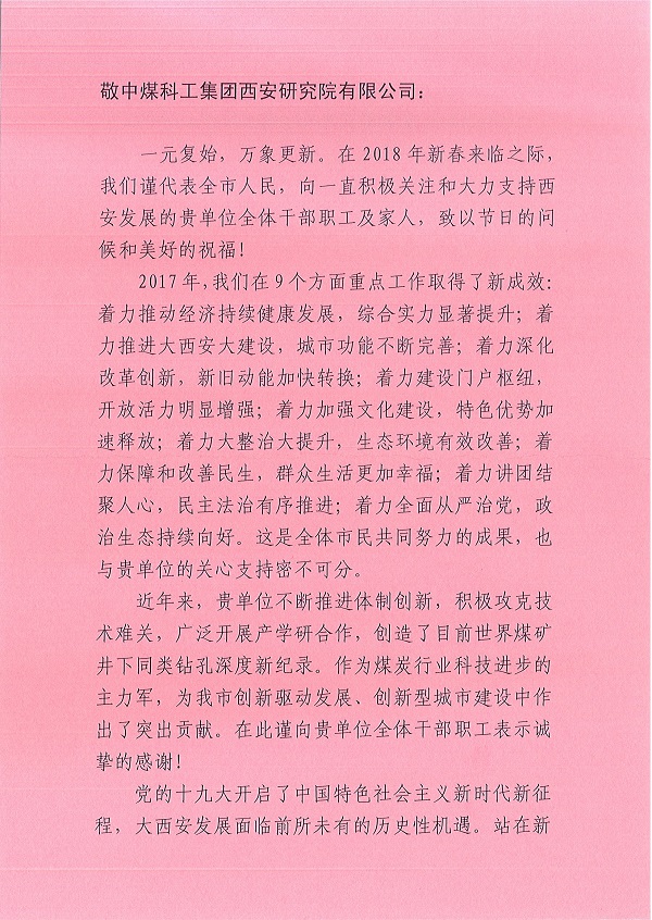 在2018年新春佳节来临之际,中共西安市委、西安市人民政府给西安研究院全体干部职工及家人发来新春慰问信,全文如下: