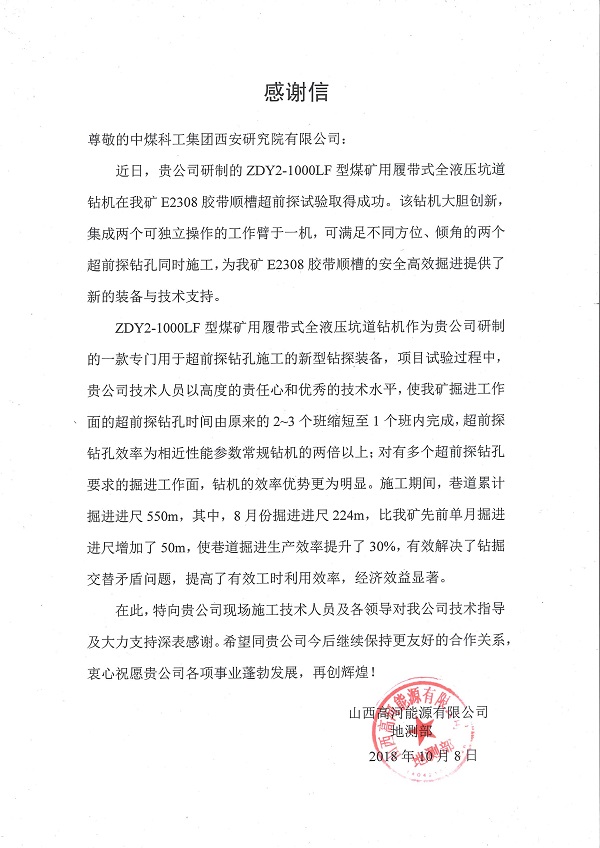 钻机在高河能源有限公司E2308胶带顺槽共完成了超前探钻孔施工6次。针对矿方需求,配套Φ50mm外平钻杆和Φ75mm金刚石复合片内凹钻头,完成钻孔10个,最大钻孔深度200m,其中100m钻孔5个,200m钻孔2个,累计钻孔深度1065m。试验期间,钻机使超前探钻孔施工由矿方原来的2~3个班缩短至1个班内完成,钻孔效率为相近性能参数常规钻机的两倍以上。试验过程中,巷道累计掘进进尺550m,其中8月份掘进进尺224m,比矿方先前单月掘进进尺高出50m,经济效益显著。试验结束后,高河能源有限公司对西安研究院研制的新装备及提供的技术支持给予高度认可,并向西安研究院发来感谢信(附后)。