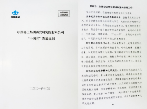 中国煤科·西安研究院始终坚持以习近平新时代中国特色社会主义思想为指引,认真落实集团公司“1245”总体发展思路,将企业文化作为推动企业高质量发展的内生动力,作为支撑企业战略目标实现的核心保障,坚持守正创新,持续加强总体规划,严格规范企业标识,有序开展主题活动,切实履行社会责任,不断强化企业品牌传播,在2021年度集团公司企业文化建设考评中获得“优秀”,荣获“集团公司企业文化建设示范单位”荣誉称号。