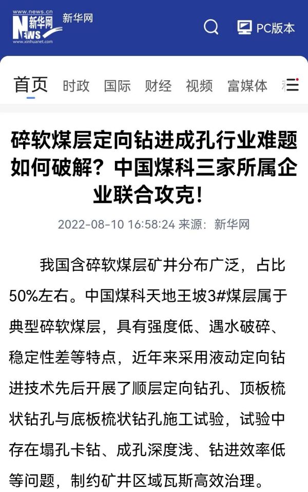 我国含碎软煤层矿井分布广泛,占比50%左右。中国煤科天地王坡3#煤层属于典型碎软煤层,具有强度低、遇水破碎、稳定性差等特点,近年来采用液动定向钻进技术先后开展了顺层定向钻孔、顶板梳状钻孔与底板梳状钻孔施工试验,试验中存在塌孔卡钻、成孔深度浅、钻进效率低等问题,制约矿井区域瓦斯高效治理。