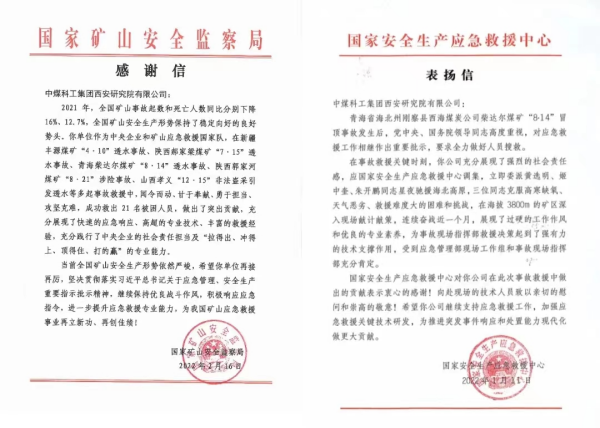 2022年年初,西安研究院先后收到国家矿山安全监察局及国家安全生产应急救援中心发来的感谢信和表扬信,对西安研究院在2021年我国矿山安全事故救援中作出的突出贡献表示感谢,对西安研究院专家和技术人员在救援中表现出的高超的专业技术、过硬的工作作风表示充分肯定,并称赞西安研究院充分践行了中央企业的社会责任及“拉得出、冲得上、顶得住、打得赢”的专业能力。
