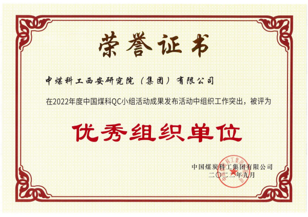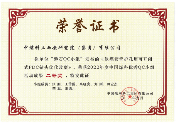 近日,中国煤炭科工集团有限公司发布表彰通知,西安研究院被评为2022年度集团公司QC小组活动优秀组织单位;由钻探装备制造公司主持完成的《提高Φ89常规钻杆使用寿命》和《软煤筛管护孔用可开闭式PDC钻头优化改型》两项QC小组活动成果荣获2022年度中国煤炭科工集团QC小组活动优秀成果二等奖,其中,《提高Φ89常规钻杆使用寿命》代表中国煤炭科工集团参加第五届中央企业QC小组成果发表赛并获二等奖。