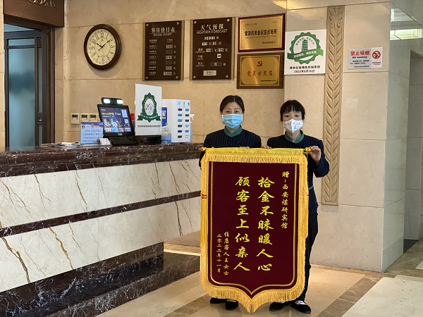 11月1日,西安研究院物业与后勤服务中心煤研宾馆收到一面题有“拾金不昧暖人心 顾客至上似亲人”的锦旗,是住店客人对客房员工张凤花、丁春爱拾金不昧行为的真挚感谢。