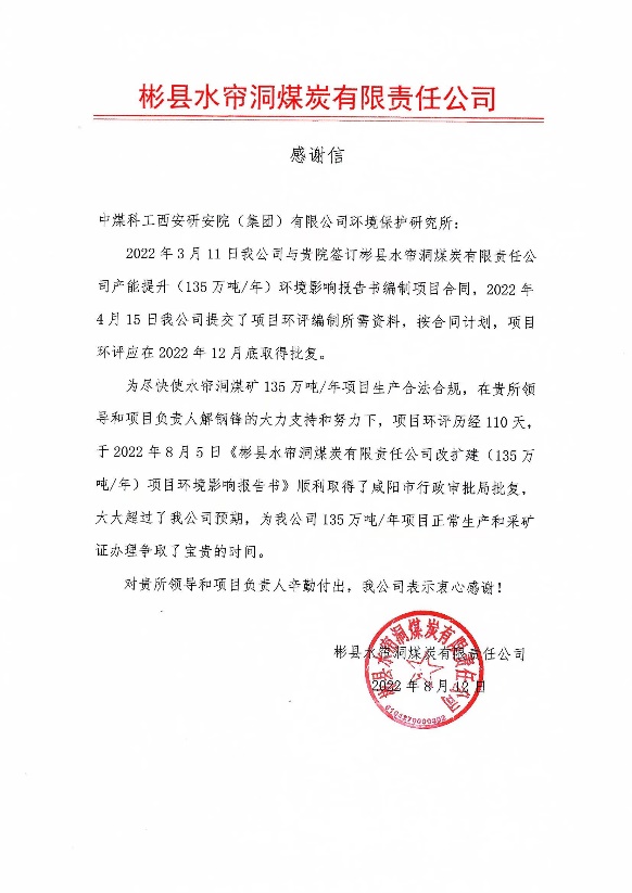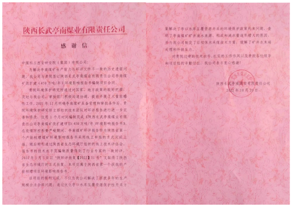 近日,西安研究院环保所收到水帘洞煤矿、山东能源西北矿业旗下亭南矿业陆续发来的感谢信,对西安研究院承担的环评项目为其解决了技术难题、节省了大量宝贵时间等方面表示衷心感谢,这是对西安研究院环保所技术实力和用心服务客户的态度的充分肯定。
