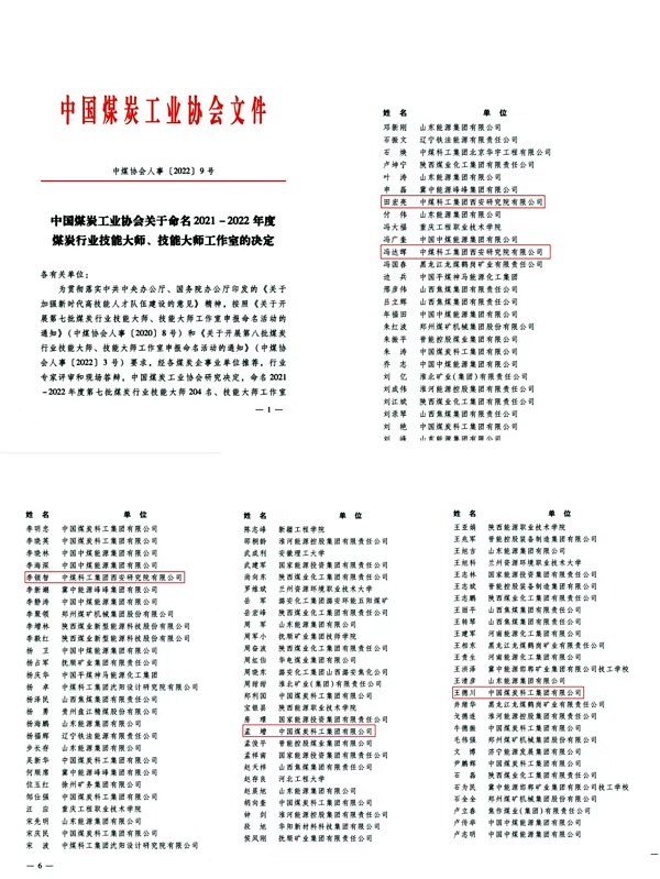 日前,中国煤炭工业协会下发《关于命名2021-2022年度煤炭行业技能大师、技能大师工作室的决定》,西安研究院田宏亮、李锁智、冯达晖、孟增、王德川5位同志被授予“煤炭行业技能大师”荣誉称号。