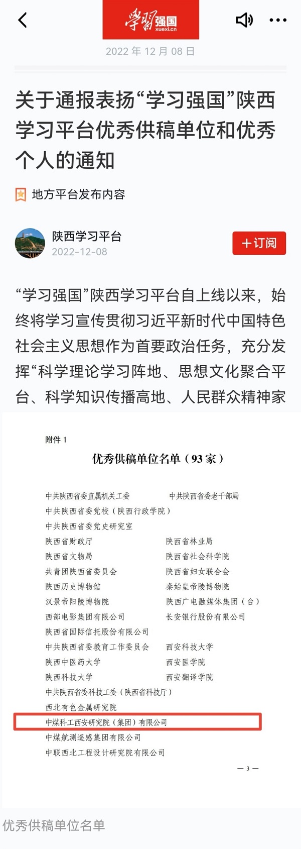 西安研究院党委始终把学习好、使用好、推广好“学习强国”学习平台作为重要政治任务和宣传思想工作责任目标。将用好“学习强国”学习平台列为宣传思想工作的重要内容,纳入党建工作考核体系,形成比学赶超的良好局面。不断拓展延伸学习渠道和阵地,以人为本、聚集一线策划宣传专题,把主角面向基层一线职工,旗帜鲜明地引导广大职工,那些在平凡岗位上不懈奋斗的人,才是最值得尊敬的。通过“奋斗者”“劳动者”“科技创新先进集体和个人”等宣传专题的策划,让越来越多的一线劳动者体会到自豪感、归属感。围绕“五一”“六一”“七一”等关键时间节点,专题策划组织相应活动稿件,激发职工的主人翁意识。聚焦科技创新和产业发展策划组织稿件,不断提高稿件数量和质量;2022年,在学习强国平台刊发科技类文章25篇,以通讯、科普等群众喜闻乐见的形式在学习强国平台组织刊发产业发展类稿件15篇。