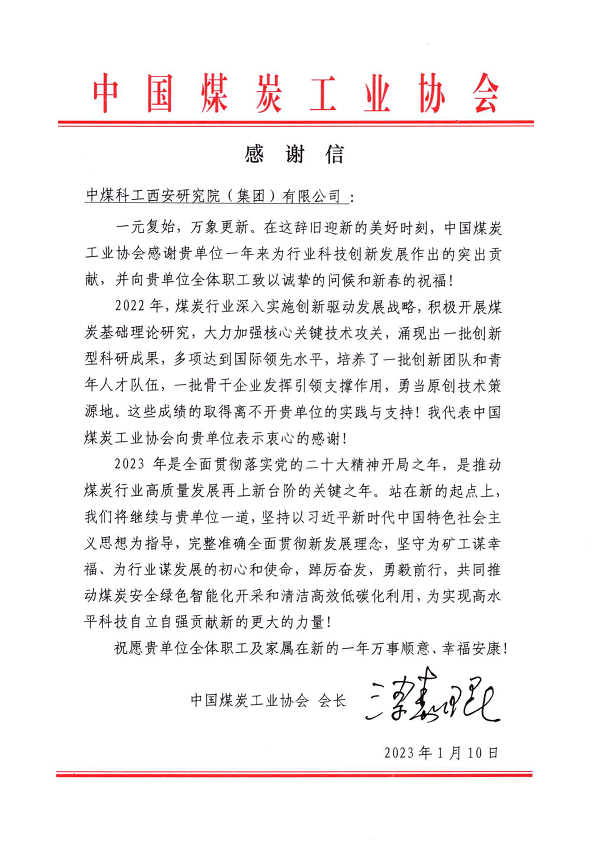 1月10日,西安研究院收到中国煤炭工业协会发来由梁嘉琨会长署名的感谢信,信中肯定了一年来西安研究院在煤炭基础理论研究、核心关键技术攻关、创新团队建设与青年人才培养等方面取得的优异成绩,对西安研究院为行业科技创新发展做出的突出贡献表示感谢。