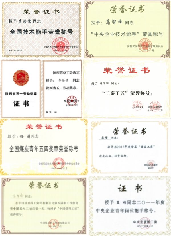 经过精心培育培养,西安研究院建立了一支高水平技能队伍,其中,入选第二批中央企业“大国工匠”培养支持计划1人,“全国技术能手”2人,“中央企业技术能手”9人,“中央企业青年岗位能手”7人;陕西省五一劳动奖章2人,陕西省“三秦工匠”3人,“陕西省技术能手”17人,陕西省青年岗位能手2人;“煤炭行业技能大师”4人,“全国煤炭青年五四奖章”2人。“西安市首席技师”2人,西安市首届“十佳优秀工人”1人,“西安十佳工匠之星”1人,“西安工匠”3人,“西安市技术能手”5人,“西安市技术标兵”1人;“中国煤科工匠”3人,中国煤科技术能手”17人。