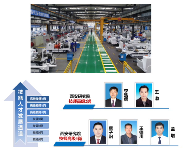 西安研究院高度重视技能人才职业通道建设。之前,由于受“重学历、轻能力”“重知识、轻技能”“重白领、轻蓝领”的传统观念制约,产业技能工人晋升通道受限,发展空间狭窄。为了充分激发技能工人的积极性和创造性,西安研究院建立完善了技能人才队伍的职业晋升通道,设置了技师高级1岗、技师高级2岗、技师高级3岗,其中,技师高级1岗享有院中层正职待遇、技师高级2岗享有院中层副职待遇、技师高级3岗享有院中层助理待遇,通过职业晋升通道的设立和打通,实现了将优秀技能工人与专业技术型人才、管理型人才放在同等重要的位置,一视同仁,做到一同培养、一同选拔、一同考核、一同使用。