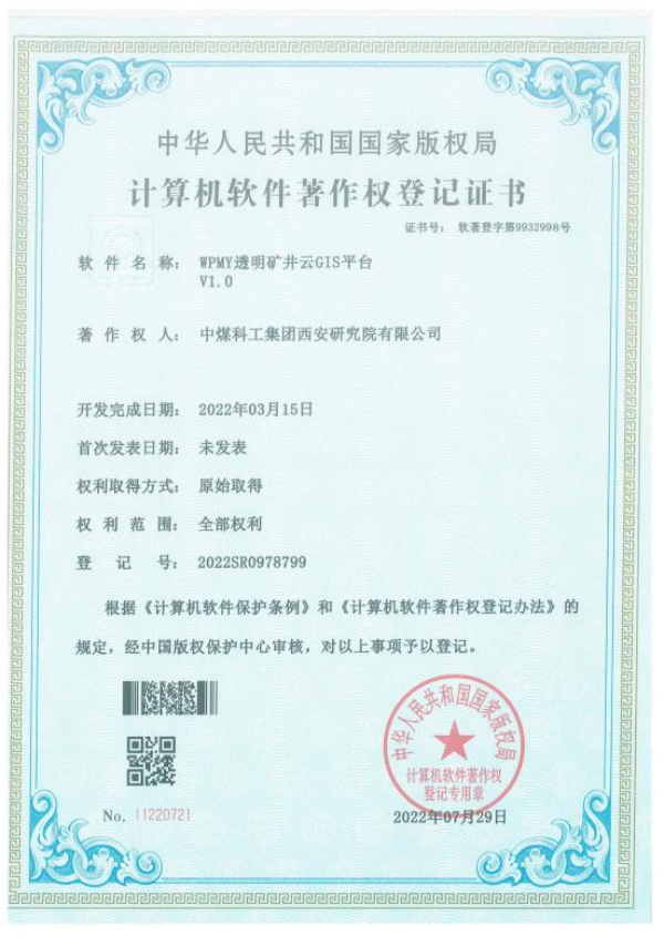 2022年西安研究院在透明地质领域积极开展知识产权保护工作,受理专利50项,其中发明专利39项,外观专利9项,实用新型专利2项;授权专利18项,其中发明专利9项,外观专利1项,实用新型专利8项;荣获省部级科技奖励十余项;登记软件著作权24项,其中作为构建透明矿井专用的云GIS平台—“透明矿井云GIS平台”在业内率先开发成功,并在天地王坡煤业成功应用。