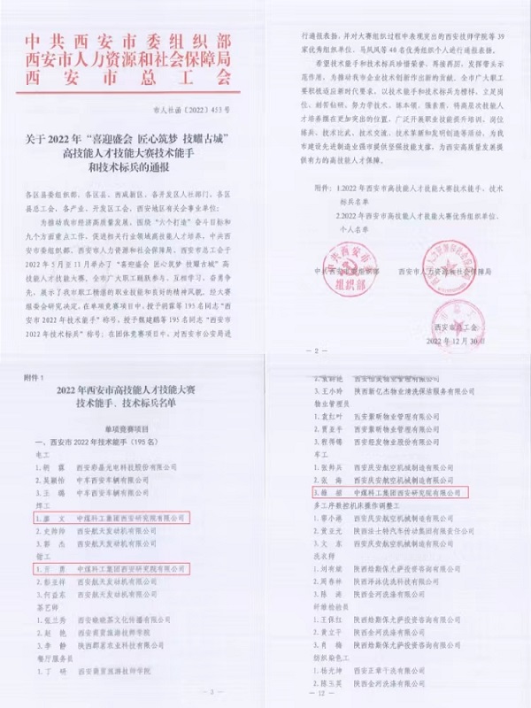 近日,中共西安市委组织部、西安市人力资源和社会保障局、西安市总工会联合发布了《关于2022年“喜迎盛会 匠心筑梦 技耀古城”高技能人才技能大赛技术能手和技术标兵的通报》,《通报》对在高技能人才大赛中荣获技术能手、技术标兵的参赛选手和优秀组织单位、个人予以表彰,西安研究院钻探装备制造公司廖文、亓勇、雒招3名同志获得“西安市2022年技术能手”荣誉称号。