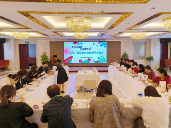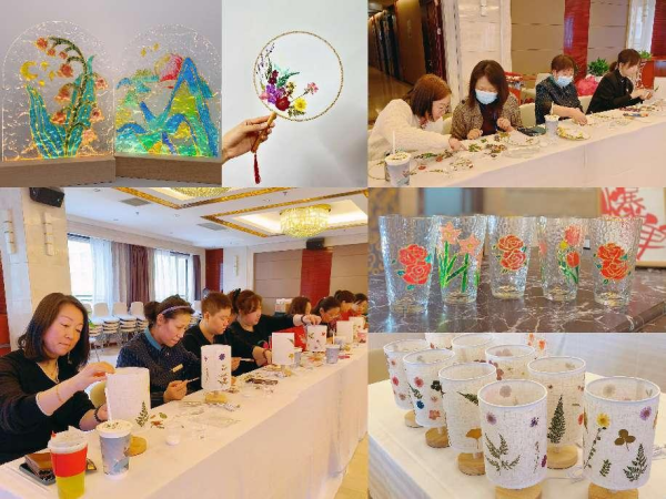 活动现场准备了团扇、布艺灯、玻璃杯等制作材料,并邀请两位手作师讲解制作工艺和装饰技巧。经过近两小时的专心创作,大家完成了压花团扇、压花布艺灯、手绘玻璃灯与手绘玻璃杯的各类制作。其中不乏创意高手,有的给压花灯赋予了花红柳绿的春日盛景;有的下笔绘山河,将千里江山“只此青绿”跃然指尖。制作过程中,大家相互交流心得,充分展示了新时代女性对盛世大“美”和生活小“美”的不同理解与丰富表达。