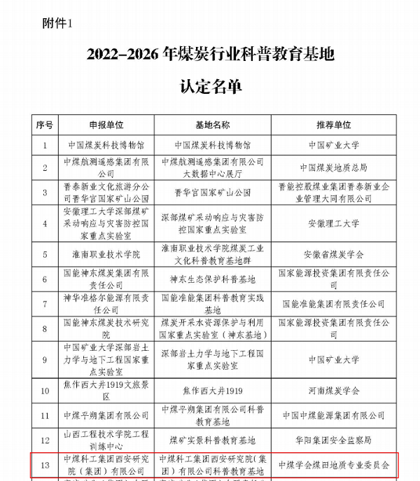 日前,中国煤炭学会公示了“2022-2026年煤炭行业科普教育基地拟认定名单”,西安研究院科普教育基地位列其中。