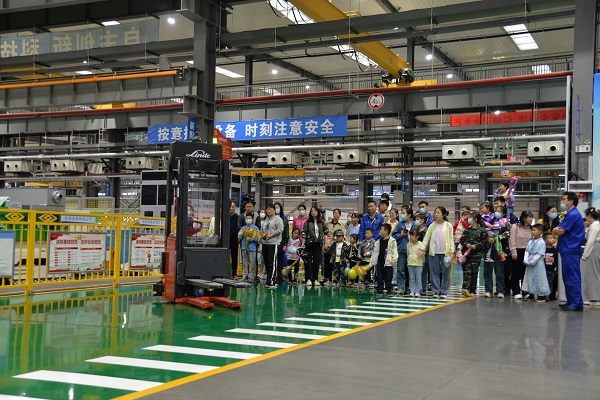 在观看安全宣传片后,小朋友们跟随家长开启了车间“探秘”之旅。首先参观了制造公司文化长廊,了解了父母工作环境的变迁历史,感知父母工作的辛苦、劳动的艰辛。随后观看了智能升降立体库演示、AGV智能物料配送、摩擦焊接无人工作站等智能化装备,小朋友们聚精会神地听着讲解、看着演示,不时问着爸爸妈妈各种问题,惊讶声、感叹声此起彼伏。