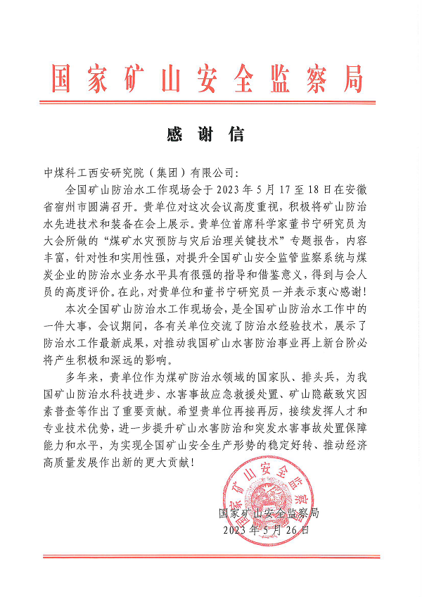 近日,中国煤科西安研究院收到国家矿山安全监察局发来的感谢信,信中充分肯定了西安研究院作为国家煤矿防治水领域国家队、排头兵的地位,以及西安研究院在推进矿山防治水科技进步、水害事故应急救援处置、矿山隐蔽致灾因素普查等方面做出的突出贡献。