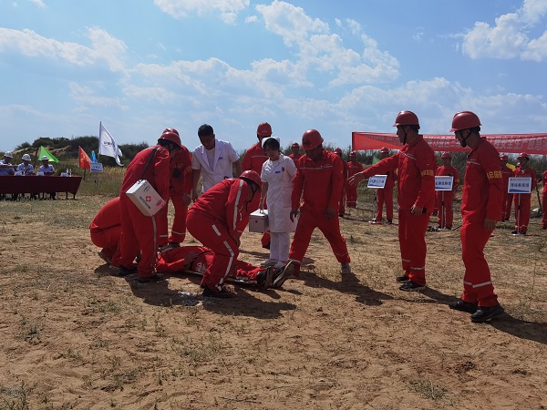 6月20日上午,地震所在安徽淮北煤电技术学院教学矿井模拟矿井井下爆破作业诱发巷道片帮,造成1人小腿和手臂骨折、1人被片帮煤块埋住,情况十分危急。项目经理联系调度员立即启动应急救援预案,现场抢险组、医疗救护组、对外协调组、安全警戒组和物资保障组等5个小组接到命令后齐奔事故现场,开展现场救援工作。各小组各司其职,紧密配合、精准施救,演练圆满完成。