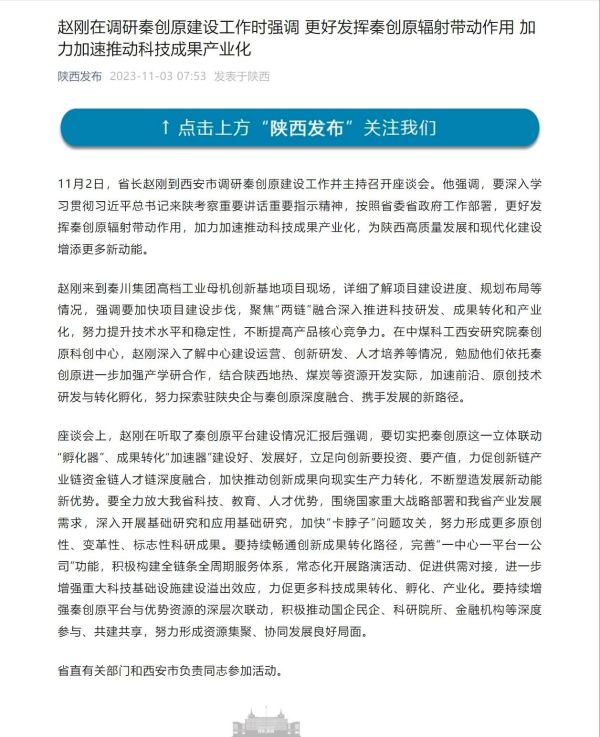 11月2日,陕西省委副书记、省长赵刚一行到西安研究院秦创原科创中心调研指导工作,西安研究院党委书记、董事长杜耀波陪同调研。赵刚一行现场了解西安研究院秦创原科创中心的建设运营和人才培养等情况,深入了解了西安研究院在地热能开发利用、煤矿透明地质保障建设等领域的科技创新成果;勉励大家要依托秦创原进一步加强产学研合作,结合陕西地热、煤炭等资源开发实际,加速前沿、原创技术研发与转化孵化,努力探索驻陕央企与秦创原深度融合、携手发展的新路径。