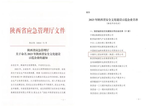 近日,陕西省应急管理厅正式发布了2023年陕西省安全文化建设示范企业名单,中国煤科西安研究院成功入选该名单,荣获陕西省安全文化建设示范企业称号。