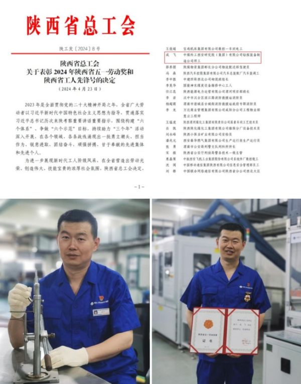 日前,从陕西省总工会传来喜讯,西安研究院钻探装备制造公司成飞荣获“2024年陕西省五一劳动奖章”。